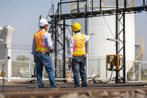 Engineers inspecting storage facility and rail infrastructure on site, Safety inspectors reviewing industrial plant operations, Team conducting facility inspection at industrial transportation hub
