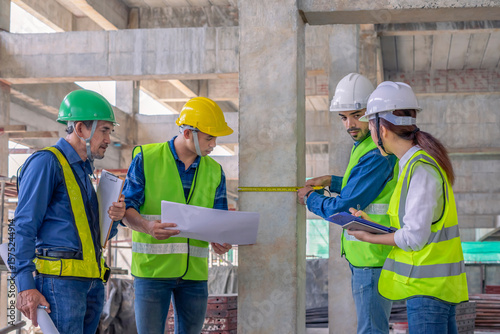 engineers team inspecting structure of a building is under new construction,measuring concrete column with tape according to the blueprint,construction engineering,internal inspection,quality control
