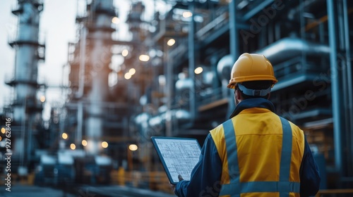 Engineers wearing safety gear, including hard hats examining survey a large blueprint tablet standing industrial facility gas or oil refinery