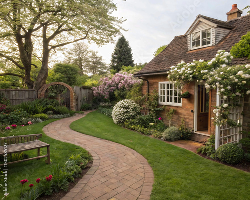 english country house with garden, Backyard cottage garden on brown pavement, green grass lawn