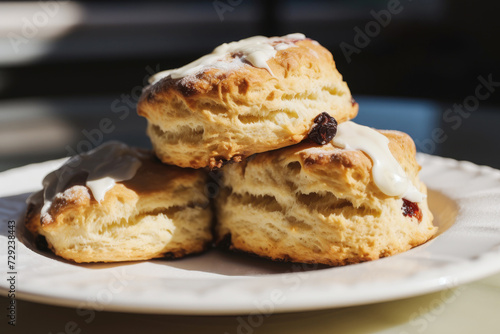 English cream tea, scones close up with raisins or sultanas, british cornish pastries