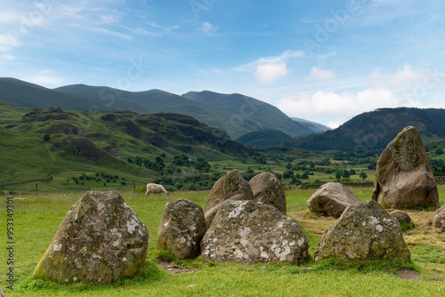 English Heritage Castlerigg Stone Circle of 5000 years old near Keswick, UK in the Lake District National Park on a hill overlooking surrouning hills and mountains against a white clouded blue sky