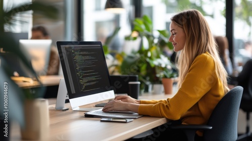 woman, office, computer, coding, programming, technology, interaction, efficiency, workspace, collaboration, modern, casual attire, design, professional, developer, green plant, productivity, sharpened, screen, process, software, datum, laptop, entrepreneur, business, innovation, team, connection, digital, creative, bright, contemporary, lifestyle, work, career, typing, concentrated, device, casual clothes, interior, working woman, successful, inspiration, engagement