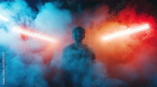 man, smoke, neon, light, studio, portrait, silhouette, fog, colours, red, blue, dark, mystery, atmosphere, artistic, dramatic, person, male, model, fashion, haze, tube, glowing, bright, intense, cool, warm, contrast, shadow, figure, enigmatic, surreal, abstract, visual, art, image, photo, style, creative, modern