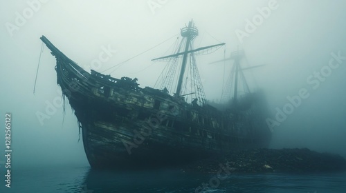 shipwreck, fog, misty, mysterious, nautical, ocean, sea, water, derelict, ruin, antique, vintage, weathered, decaying, dramatic, atmospheric, gloomy, dark, adventure, mystery, exploration, history, maritime, sailing vessel, galleon, wreck, coast, shoreline, solitude, eerie, haunted, suspense, thriller