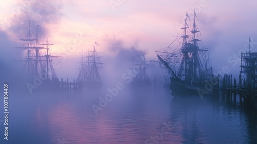 pirate, harbor, dawn, eerie, fog, rolling, shadowy, figure, dock, wood, mysterious, atmosphere, scene, pirate, sea, ocean, coast, nautical, skittish, haunting, silhouette, enigmatic, fantasy, adventure