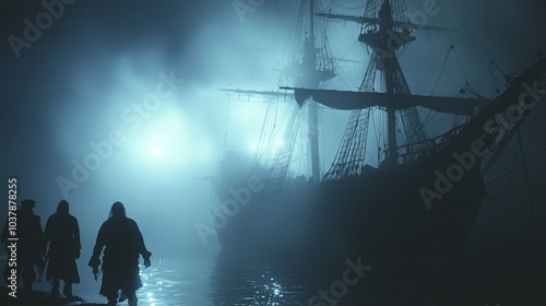 mysterious, fog, pirate, ship, ghostly, island, eerie, shadowy, figure, moving, deck, lantern, flickering, light, skittish, atmosphere, nautical, maritime, haunted, dramatic, seafaring, surreal, fantasy, adventure, ambience, night, detailed