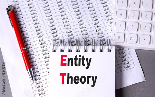 ENTITY THEORY text on notebook with chart , pen and calculator