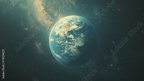 Environmental planet orbit, In the vastness of space, a serene planet orbits gently, surrounded by shimmering stardust and cosmic wonders