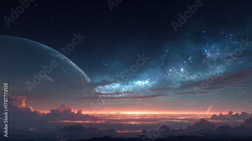 Epic cinematic cosmic sky, glowing horizon, massive planets in the sky, stars and nebulae, futuristic city skyline on the ground, glowing lights