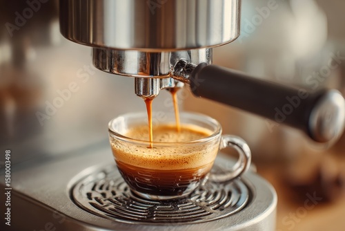 Espresso pours into a clear glass cup from a stainless steel coffee machine. Use this image for cafe menus, drink blogs, and coffee product advertisements.