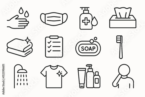 hygiene, icon, mask, soap, shower, cleaning, health, sanitation, towel, checklist, toothbrush, tissue, laundered, care, protection, cleanliness, safety, routine, clean, wellness, bathroom, essential, illustration, hand