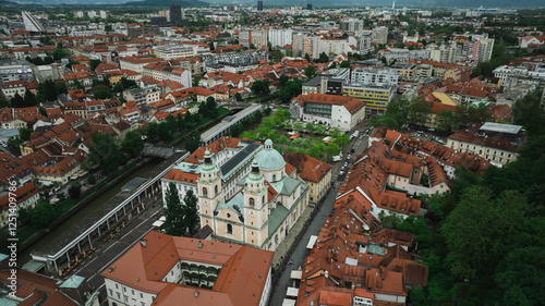 aerial view, architecture, building, building, built structure, capital, cathedral, center, church, city, destination, drone, europa, european, facades, franciscan, house, ljubljana, mediaeval, mediterranean, old, panorama, panoramic, panoramic view, pedestrian, promenade, river, romantic, roof, rooftop, slovenia, square, statue, street, top, tour tourism, holiday maker, town, travel, urban, urban scene