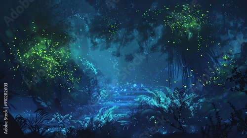Ethereal blue and green forest scene with glowing fireflies. An enchanting nighttime landscape perfect for fantasy or magical themes.