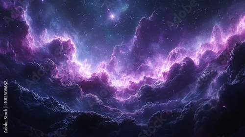 Ethereal cosmic clouds with vibrant purple and blue hues filling the starlit sky.