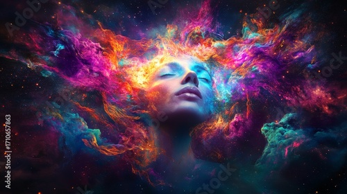 colourful, nebula, star, abstract, visionary, beauty, harmony, atmosphere, peaceful, universe, dream, majestic, aethereal, wonder, cosmos, glow, spirit, mystical, astral, colours, dreamlike, portrait, energy, light, space, infinite, meditation, awe, female, cosmic, celestial, phenomena, explosion, art, galactic, surreal, face, hallucinogen, feminine, imagination, vibrant, fantasy
