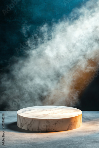 Ethereal marble podium surrounded by mist and soft lights a serene showcase of elegance and ambiance