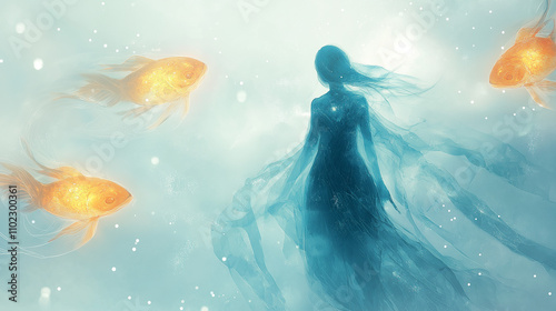 Ethereal Pisces character with glowing fish, delicate scales, and water-like gown, set against celestial and underwater elements on a white background for mystical themes.