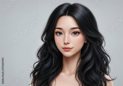 portrait, black hair, woman, beauty, female, long hair, face, hair, coiffure, young, beautiful, style, person, elegant, make-up, glamour, eye, model, fashion, attractive, coiffure, skin, look, gorgeous, honed, fresh, natural, studio, charming, confidence, serenity, elegance, vogue, art, illustration, design, digital, drawing