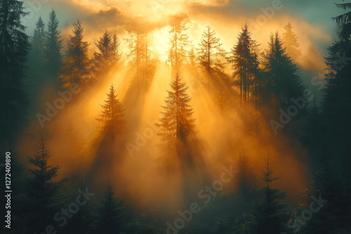 Ethereal Radiance, Sunbeams Illuminate the Misty Forest Canopy