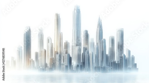 Ethereal skyline of modern skyscrapers shrouded in mist over a tranquil water surface
