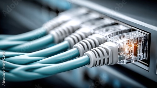 Ethernet cables connected to a network switch, symbolizing data transfer and internet connectivity.