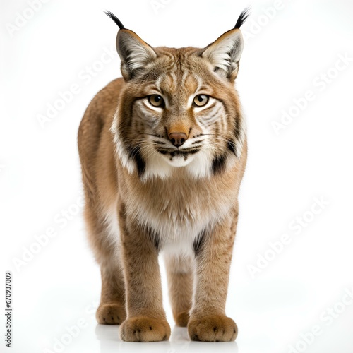 Eurasian lynx. Lynx isolated on white background with shadow. Eurasian lynx looking into the camera. Big cat wildlife