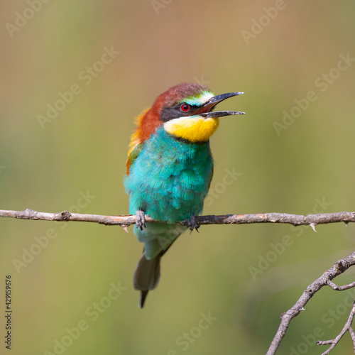 European bee eater Merops apiaster sitting on a branch with its beak open