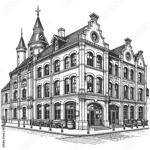 European beer factory brewery building with detailed architectural features, street view scene sketch engraving generative ai vector illustration. Scratch board imitation. Black and white image.
