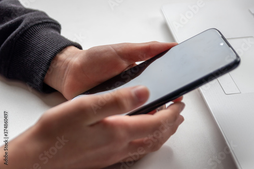 European child hands holding black smartphone with fingers and black screen on white desk infront of white notebook at school for research and mobile gaming or game addiction of kids and grown ups