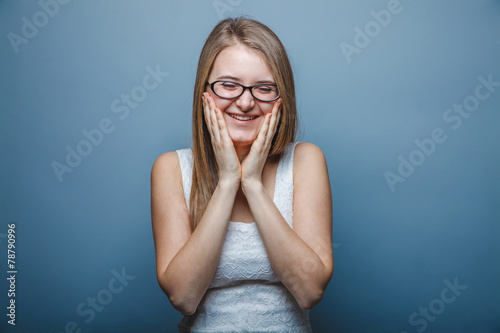 European-looking girl of twenty years with glasses, surprise, ha