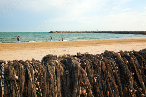 evening at the beach of Les Saintes Maries de la Mer seen from the fishing harbour, fishnets drying in the sun in foreground