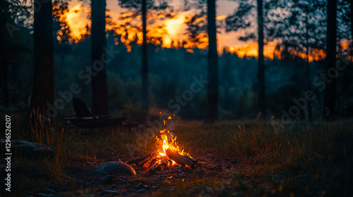 Evening campfire in a dark forest with orange sunset glow warm cozy wild wood woods night trees flame