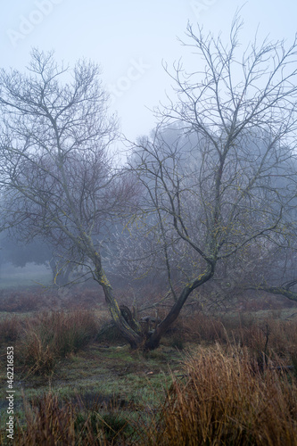 evergreen oak fallen in swamp in the middle of the field in morning with dense fog, tagamanent catalonia spain