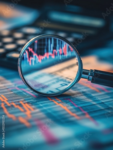 Examining stock market trends with a magnifying glass and calculator in a modern financial environment