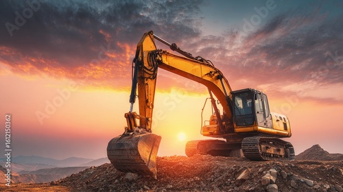 Excavator at Sunset: Heavy machinery silhouetted against a vibrant sky. Earthmoving and construction with stunning natural backdrop. Golden hour work.