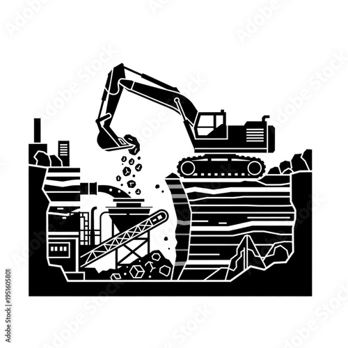 shoveling, quarry, mining, construction, equipment, machine, industry, digging, extraction, conveyer, belt, processing, site, industrial, illustration, vector, graphic, black, white, heavy, machinery, mine, pit, aggregate, resource, vehicle, crawler, track, bucket, arm, boom, operation, material, mineral, rock, stone, sand, gravel, resource, development, infrastructure, project, engineering, technology, mechanical, power, energy, raw