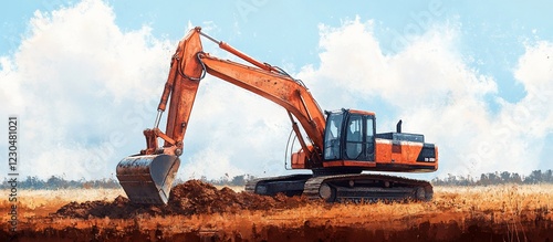 Excavator digging in a sunlit field with blue skies and fluffy clouds in the background