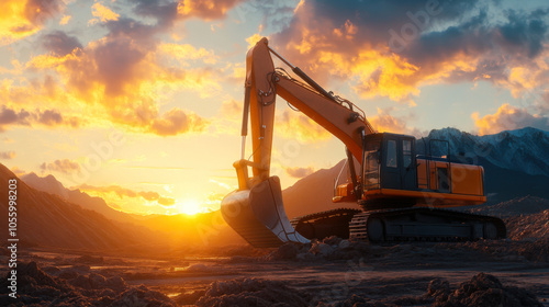 shoveling, sunset, landscape, mountain, machinery, construction, earth, moving, rugged, terrain, heavy, equipment, cloud, digging, horizon, vibrant, colours, industry, worksite, silhouette, operator, nature, site, vehicle, mechanical, mining, agricultural, infrastructure, dirt, engineering, building, restoration, environment, project, excavation, labor, sky, ground, scenic, sunrise, rocky, view, setting, sun, work, line, movement, task