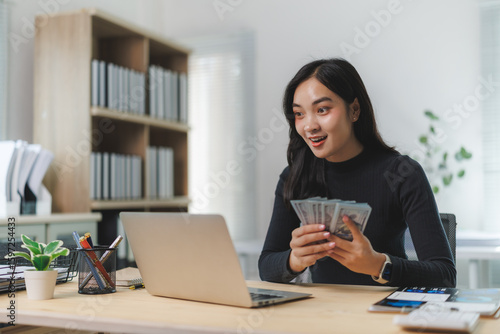 business, money, office, woman, laptop, cash, finance, success, excited, happy, businesswoman, work, financial, achievement, earning, online, payment, investment, profit, technology, wealth, career, asia, asian, young, computer, desk, indoor, counting, holding, looking, smiling, celebrate, freelance, job, men at work, corporate, cyberspace, commerce, startup, banking, transaction, salary, bonus, income, savings