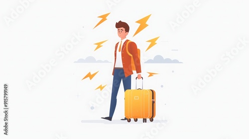 colourful, man, illustration, energetic, clean, male, smiling, backpack, professional, lightning bolt, excited, simple, casual attire, graphic design, optimistic, happy, adventure, travel, minimalism, bright, cloud, white background, business, positive, cartoon, modern, young, sky, suitcase, journey
