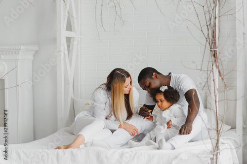 Excited multiracial young family with little girl child have fun, overjoyed happy. international mom and dad play with small girl, enjoy weekend at home together