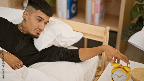 young, man, latin, lying, bed, sleep, sleeping, alarm, clock, looking at, bedchamber, room, hispanic, adult, person, portrait, photogenic, tattoo, tattooed, relax, relaxing, resting, rest, comfortable, comfort, cosy, relaxed, relaxation, morning, pajama, blanket, pillow, asleep, sleepy, sleepy, exhausted, time, timer, countdown, home, house, apartment, indoor, indoor, interior, background, nightstand, insomnia, late