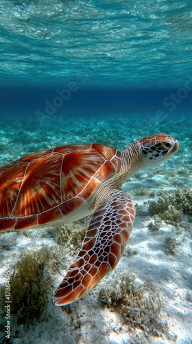 Exotic marine turtle swimming in crystal clear waters near coral reefs