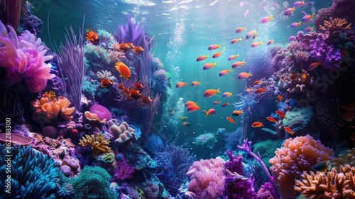 Exotic reef fish swimming through the complex structures of a vibrant coral ecosystem