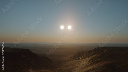 expanse. Twin suns setting over vast desert dunes during golden hour. travel magazines, destination branding, designed for travel destination branding, used by data analysts.