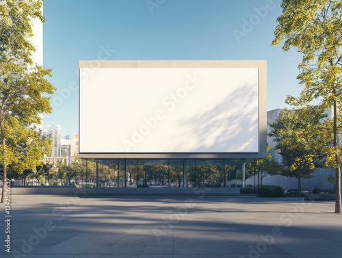 architecture, city landscape, piazza, contemporary, building, glasses, advertising, commercial, billboard, exterior, concrete, modern, public, expansive, display, outdoors, presentation, large, perspective, design, facades, signage, construction, structure, space, blank, urban, city, clear, advertisement, street, setting, daylight, communication, shadow, promotion, sunlight, sky, nobody, tree