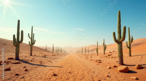 Expansive desert landscape with scattered cacti and cracked earth, bright sunlight, and warm tones, suitable for travel or nature-themed visuals.