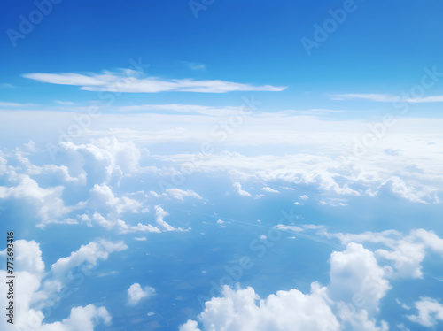 Expansive view of a cloud-filled sky from above, with the sunlight casting a soft glow on the fluffy white clouds. Generative AI