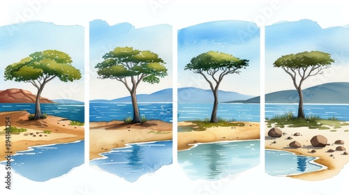 Experience a breathtaking array of isolated watercolor paintings featuring stunning natural scenes on crisp white backgrounds.